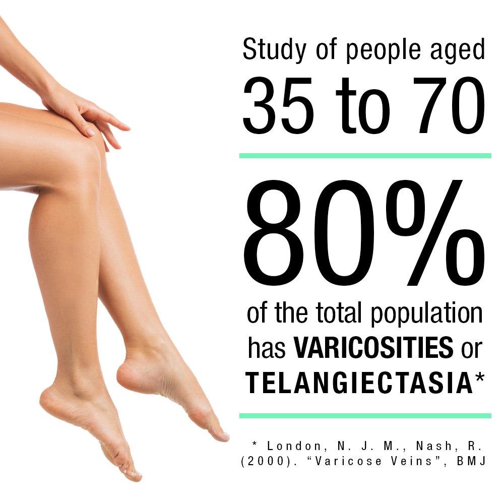 Studies show that 80% of people aged 35 to 70 suffer from varicose veins or telangiectasia.